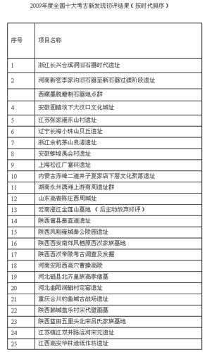 據(jù)介紹,今年的初評由國家文物局考古專家組成員、中國考古學(xué)會104位理事和63家全國考古發(fā)掘資質(zhì)單位共同投票,從60項候選項目中按得票數(shù)產(chǎn)生25個發(fā)掘項目入圍(名單附后),參加2009年度全國十大考古新發(fā)現(xiàn)終評評選。