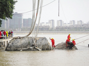 昨天下午,鎮(zhèn)江市政府在焦山南麓舉行了盛大的《瘞鶴銘》疑似殘石打撈啟動儀式。記者在現(xiàn)場看到,4股共8根特制高強度尼龍纜繩,已經(jīng)從不同部位將疑似巨石牢牢“網(wǎng)”住。記者同時獲悉,4日下午1時起,央視新聞頻道將現(xiàn)場直播打撈第一塊巨石全過程。