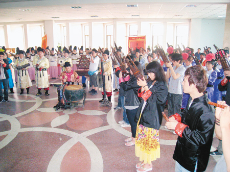 上圖為6家樂社為在中國文化遺產(chǎn)日期間舉行大型西安鼓樂演出進行排練。