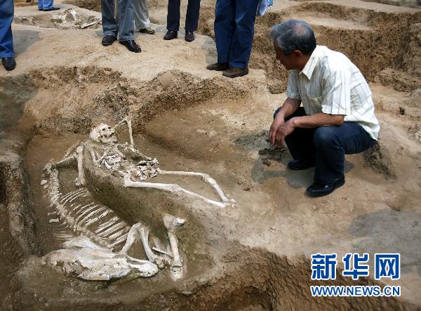 這是6月6日拍攝的洛陽市林校西周洛邑祭祀遺址的人馬組合坑。當日,河南洛陽市文物局組織專家對洛陽市林校西周洛邑祭祀遺址考古發(fā)現(xiàn)進行研討并向媒體發(fā)布了發(fā)掘成果。這處遺址西距瀍河約1公里,西北距北窯西周墓地及西周鑄銅遺址約4公里,總發(fā)掘面積為945平方米,于2009年2月開始發(fā)掘。考古人員在洛陽市林校工地共發(fā)現(xiàn)西周灰坑59座、流水溝1條、墓葬14座以及唐代灰坑42座,其中31座西周祭祀坑的發(fā)現(xiàn)是本次發(fā)掘的重要收獲,為尋找西周洛邑城址提供了又一重要線索。新華社發(fā)(張曉理 攝)