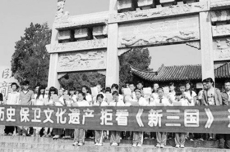 5月29日上午8點(diǎn),南陽(yáng)數(shù)百網(wǎng)友還在臥龍崗山門(mén)前的“千古人龍”牌坊下,拉起條幅,30名小學(xué)生齊聲誦讀前《出師表》,游人與市民簽名聲援。活動(dòng)的最后,幾名網(wǎng)友還抬出一臺(tái)電視機(jī)當(dāng)場(chǎng)砸毀,以示對(duì)新《三國(guó)》的抗議。