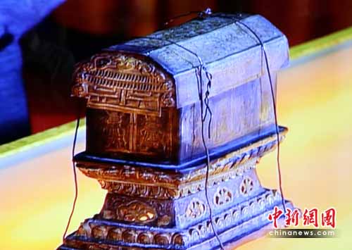 2008年南京發(fā)掘大報(bào)恩寺遺址,發(fā)現(xiàn)大報(bào)恩寺是在宋長干寺地宮上重建的,并出土了一塊刻有《金陵長干寺真身塔舍利石函記》的碑文,碑文記載“長干寺葬佛頂骨舍利”。在地宮中,一個(gè)大鐵函被請出地宮,隨后在南京博物院考古專家從鐵函中請出了七寶阿育王塔,并在塔內(nèi)發(fā)現(xiàn)有二套可能盛放舍利的容器,一套鎏金銀槨;另外一套為方形銀函槨、函內(nèi)都有安置舍利的金棺,佛頂真骨安奉其中。