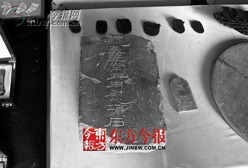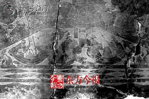 在已發(fā)現的曹操墓畫像石中,比較完整的都是從盜墓賊手中繳獲的。這些畫像石畫工精細嫻熟,有“神獸”、“七女復仇”等圖案,并刻有“主簿車”、“咸陽令”、“紀梁”、“侍郎”、“宋王車”、“文王十子”、“咬人”、“飲酒人”,等等,另外還有門簪、雕龍等殘塊。