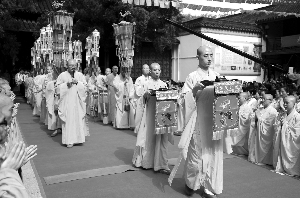 7:50,迎請法會結(jié)束,棲霞寺住持隆相法師跪拜之后,小心翼翼地捧起了錦盒,向朝天宮的東門走去,傳義和曙光兩名法師隨行兩側(cè)護衛(wèi)。