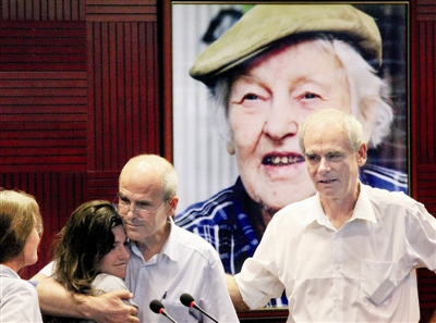 當北京外國語大學離休教授、90歲的老專家伊麗莎白來到現(xiàn)場后,寒春最小的外孫女走上前擁抱,一老一少相擁而泣。