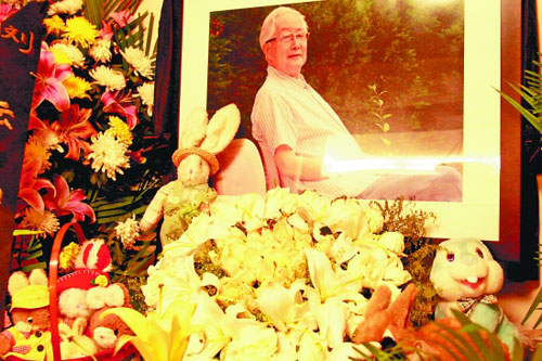 擺放在靈堂上的相片是華老的小兒子華方方在2005年春末拍攝的,就在自家樓下小花壇,一小枝綠色枝條,老人安詳?shù)男δ,氣韻生動,華老生前看過非常滿意。華老屬兔,他和兔子感情特別深,晚年更成了老小孩,睡床四周是大大小小的卡通兔、絨毛兔,他當(dāng)兔子王,F(xiàn)在這些兔子朋友環(huán)繞著他的遺像,華老一點(diǎn)都不寂寞,有兩只他最心愛的玩具兔還將陪他在墓地到老。