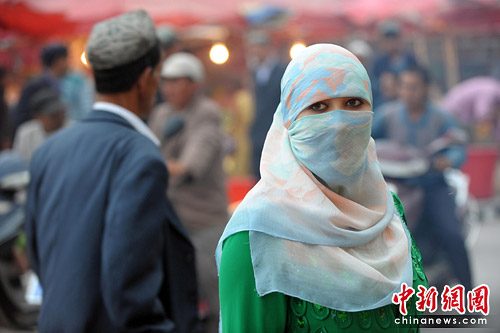 在喀什老城高臺(tái)民居,維吾爾族老人、婦女和孩子的臉上和眼睛里透出祥和、安逸;喀什街頭的烤串、馕、水果處處皆是。維族婦女身穿長(zhǎng)袍、頭戴紗巾遮面而行,迷人的眼睛顯得十分神秘,在都市形成一道耀眼的風(fēng)景。