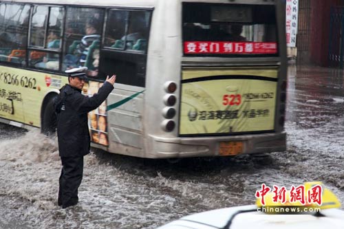 上午9時(shí),武漢市京漢大道武勝路口出現(xiàn)漬水,最深處積水達(dá)40cm,一些小轎車(chē)駕駛員由于不了解漬水深度盲目行車(chē)而致機(jī)動(dòng)車(chē)熄火。因該路段過(guò)往車(chē)輛頻繁,漬水容易造成道路堵塞,一些民警站在水中充當(dāng)路標(biāo),為車(chē)輛安全行走引導(dǎo)方向。