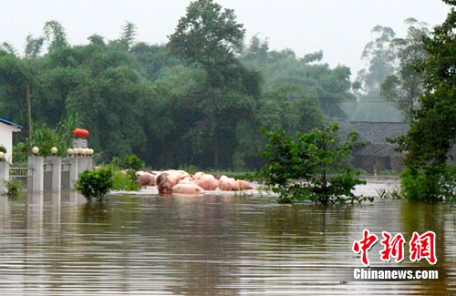 18日早上,中新網(wǎng)記者在受災(zāi)嚴(yán)重的重慶潼南柏梓鎮(zhèn)看到,雖然雨已經(jīng)停歇,但鎮(zhèn)上的洪水仍未褪去,多條街道的積水仍有半人深。洪水完全包圍了當(dāng)?shù)氐囊粋(gè)養(yǎng)豬場(chǎng),近百頭被淹的活豬成片浮在水面上,據(jù)該場(chǎng)工作人員介紹,該豬場(chǎng)養(yǎng)的6000多頭豬均被洪水淹沒,僅17日便死了1000多頭豬。因豬場(chǎng)受困之處水位較深無法救援,豬場(chǎng)場(chǎng)主只能眼睜睜看著豬被洪水沖擊漂浮。