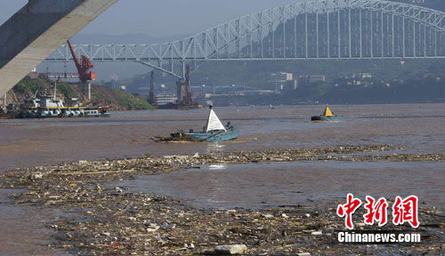 中新網(wǎng)重慶7月21日電(郭虹 朱治宇)21日,成片的渣草隨著洪峰流入長(zhǎng)江萬(wàn)州水域,幾乎占據(jù)了半個(gè)江面。記者看到長(zhǎng)江重慶航道局的4艘航標(biāo)艇在江面不停穿梭,清理懸掛在航標(biāo)上的渣草。