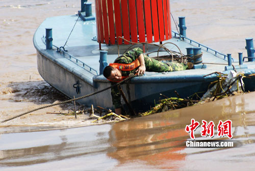 因此次洪峰對(duì)庫(kù)區(qū)航道的影響相對(duì)重慶主城較小,因此庫(kù)區(qū)萬(wàn)州段航道沒有實(shí)施禁航,江面上還有大量的船只通行。為此,萬(wàn)州的航道職工每天將花去近16小時(shí)專門清除懸掛在航標(biāo)上的渣草,恢復(fù)被渣草掀翻的航標(biāo),以免影響輪船航行的安全。
