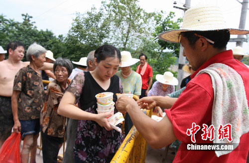 中新網(wǎng)廣安7月22日電( 廖小兵 劉長河)在剛剛遭受160年未遇的特大洪災(zāi)中,四川省廣安區(qū)肖溪鎮(zhèn)老街被整體淹滅,街道清淤還未結(jié)束,1000余人無家可歸。目前災(zāi)民生活得怎么樣?22日中午12時許,記者來到肖溪鎮(zhèn)中心街下段的災(zāi)民集中安置點,只見兩排帳篷整齊地排列,在第三號帳篷,災(zāi)民杜超華一家正在吃著香噴噴的盒飯。“洪水來得太猛了。比三年前的洪災(zāi)高了2米多,我家的東西全部被洪水沖走了。幸虧黨委政府及時伸出了援手,給我們搭建了帳篷,購置了被褥,免費提供一日三餐。晚上還給我們送來了蚊香。盡管受了災(zāi),有了黨委政府的關(guān)愛,我們的家園一定會迅速重建起來。”