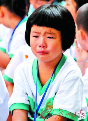 開學典禮剛進行20分鐘,一年(1)班一個已經哭得鼻子紅紅的小姑娘從自己的位置上站起來,走到老師面前,斷斷續(xù)續(xù)地說著什么。老師拍著她的肩膀說了幾句,小姑娘不情愿地坐回原位,豈料越哭越委屈,完全顧不上看臺上的表演。