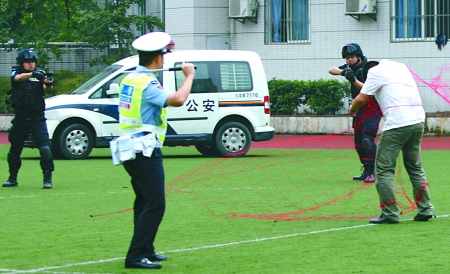 兩持刀男子沖進九龍坡區(qū)一小學,揮刀砍向攔阻他們的校園保安。正在危急時刻,端著沖鋒槍的飛龍突擊隊迅速出擊,兩張由網(wǎng)槍射出的紅色大網(wǎng)從天而降,將兩名男子圍住。5分鐘后,兩名持刀男子被擒獲。昨日下午,九龍坡區(qū)公安分局在天寶實驗學校進行了“飛龍2號”校園暴力事件處置演練。