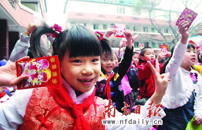 本報訊(記者/謝苗楓實(shí)習(xí)生/王芝露張晏)紅紅的中國結(jié)、大大的燈籠……昨天,廣州市140多萬中小學(xué)生正式返校上課,雖然春節(jié)已過,但孩子們還沉浸在節(jié)日的喜慶中。更開心的是,廣州還將在今年探索以補(bǔ)助方式逐步讓來穗務(wù)工就業(yè)農(nóng)民子女接受免費(fèi)義務(wù)教育。