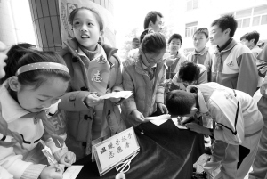 昨天,在中關(guān)村一小校園內(nèi)有六七個(gè)小分隊(duì)擺攤招募志愿者,除了系鞋帶外,潔廁、護(hù)綠、安全、節(jié)水節(jié)電、社區(qū)服務(wù)等都是志愿者分隊(duì)的服務(wù)內(nèi)容!跋M麑W(xué)生把‘志愿’意識(shí)融入生活,形成新的生活方式!痹搶W(xué)校有關(guān)負(fù)責(zé)人介紹說,新學(xué)期學(xué)校將實(shí)行志愿者注冊(cè),為學(xué)生配發(fā)志愿者證。學(xué)生志愿服務(wù)的內(nèi)容和時(shí)間、參加培訓(xùn)的經(jīng)歷、獲得的榮譽(yù)稱號(hào)、志愿活動(dòng)的證明人等都會(huì)詳細(xì)記錄在上面。學(xué)生參與志愿服務(wù)的時(shí)間每學(xué)期不得低于50個(gè)小時(shí),中高年級(jí)學(xué)生還將參加校外的社區(qū)服務(wù)活動(dòng)。晨報(bào)記者 李木易/攝