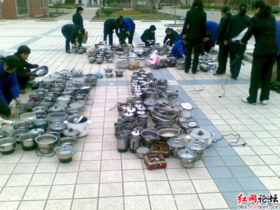 曉云指出,用熱得快燒熱水要比在天寒地凍的天氣里頂著寒風(fēng)去水房排好長(zhǎng)的隊(duì)打水方便的多:“另外學(xué)校的食堂也長(zhǎng)期處于校內(nèi)壟斷狀態(tài),飯菜越來越難吃,份量越來越少,而價(jià)錢卻越來越高,所以我們干脆自己用電飯鍋、電磁爐開伙了,改善下生活!