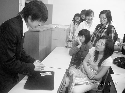 每個(gè)周日下午,魔術(shù)社宣傳部的成員都會(huì)到學(xué)校文科樓找間空教室,在黑板上寫下:“7:00魔術(shù)社活動(dòng)”,然后發(fā)短信通知各個(gè)社員準(zhǔn)時(shí)到場(chǎng)。6點(diǎn)半以后,帶著道具的社員們接踵而至。人來得差不多了,活動(dòng)就開始。先是讓兩三個(gè)新手上臺(tái)表演上次活動(dòng)學(xué)過的魔術(shù),有的新手下去沒有時(shí)間好好練習(xí),一上臺(tái)表演就緊張,新手出了錯(cuò),底下笑成一團(tuán)。