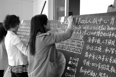 晚報(bào)訊 為提高教師教學(xué)基本功,上海第二工業(yè)大學(xué)日前舉行以“迎世博爭(zhēng)做主人、抓中心育人為本”為主題的教職工板書(shū)競(jìng)賽,首次邀請(qǐng)學(xué)生做評(píng)委給老師打分。由各學(xué)院選拔出的35名教師分老、中、青三個(gè)年齡組進(jìn)行比賽,評(píng)分標(biāo)準(zhǔn)由版面構(gòu)思合理、用規(guī)范字、筆畫(huà)清楚有力等方面組成。比賽裁判組邀請(qǐng)了各學(xué)院教學(xué)院長(zhǎng)等18 人進(jìn)行現(xiàn)場(chǎng)評(píng)分,同時(shí)首次邀請(qǐng)30位學(xué)生學(xué)習(xí)委員代表一起參與評(píng)分。比賽現(xiàn)場(chǎng)吸引了數(shù)百名教職工前來(lái)觀摩、取長(zhǎng)補(bǔ)短。 □記者 肖波 攝影 蔣世偉