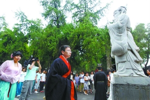 本報訊 今天上午,孔廟大成門下、孔子像前,孔廟和國子監(jiān)博物館首屆“成人傳統(tǒng)禮儀”在這里隆重舉行,包括2009年北京高考文理科狀元劉庭梅、寧少陽在內(nèi)的160多名學(xué)生參加活動,然而主辦方和媒體過分關(guān)注臺上兩位狀元的一舉一動,讓臺下的學(xué)生備受冷落。
