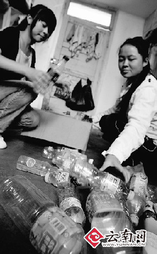 近日,記者路過昆明學院醫(yī)學院(原昆明市衛(wèi)生學校)時,遇見三五成群的學生把廢棄的飲料瓶拿繩子拴著抬著走出校門,一打聽才知道原來是學生們撿飲料瓶賣后換成錢當班費。學校黨委副書記曹全科昨天告訴記者:“這種做法是10年前就開始養(yǎng)成的,如今學生撿飲料瓶攢班費在學校里蔚然成風,全校28個班級的2000多名大學生都自覺撿瓶子、賣瓶子,錢拿來當做班費!