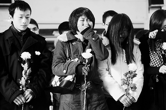 遺體告別儀式開(kāi)始了。大家朝楊濟(jì)源三鞠躬后,紛紛獻(xiàn)上了白菊花,一直強(qiáng)忍著悲痛的楊媽媽再也支持不住了,好幾次沖到濟(jì)源身邊,想再摸摸兒子的臉龐。