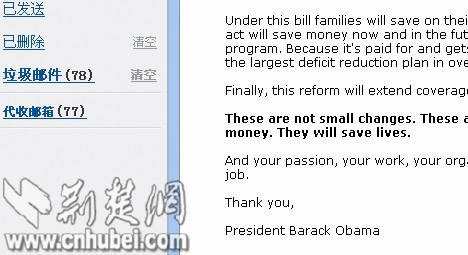 楊志為2007年畢業(yè)于華中科技大學(xué)新聞傳播學(xué)院,目前在深圳一家投資公司工作。昨天,他將收到的四封美國郵件轉(zhuǎn)發(fā)到記者的電子郵箱,這四封英文信,有兩封署名美國OFA組織秘書長米其,另兩封則直接署名美國總統(tǒng)奧巴馬。