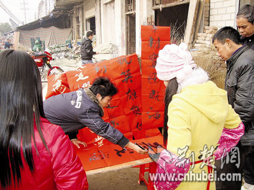 昨日上午,成家良開始擺攤賣春聯(lián),不一會兒就引來了不少圍觀的人。一名小伙子花了10元錢買下一副火星文春聯(lián),他說,成家良賣的是非主流春聯(lián),夠創(chuàng)意,但“不知道家里人能不能接受”。也有圍觀的老人不贊同成家良的創(chuàng)意:“他對書法的精髓還沒有完全掌握好,就想著去創(chuàng)新,未免太心急了!