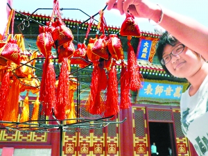 本報(bào)訊(記者李環(huán)宇)今天8時(shí)30分,孔廟和國(guó)子監(jiān)博物館的大門(mén)剛剛打開(kāi),專程趕來(lái)的市民吳先生便徑直來(lái)到位于孔廟大成殿西南側(cè)的祈福包售貨處,興沖沖地為今年參加高考的女兒購(gòu)買了一只黃色的祈福包。隨著高考的臨近,有著“金榜題名”、“狀元及第”等吉祥寓意的祈福筆、祈福包等物件受到了考生和家長(zhǎng)的青睞,而全國(guó)聞名的北京孔廟和國(guó)子監(jiān)博物館出售的祈福包更是受到家長(zhǎng)和考生們的追捧,有的家長(zhǎng)甚至坐飛機(jī)專程從外地趕來(lái)孔廟,只為“求”個(gè)祈福包。