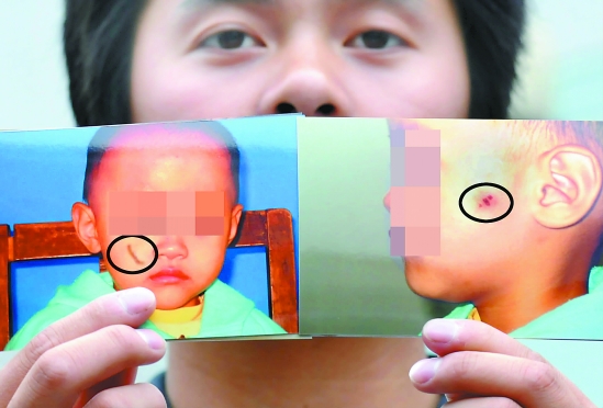 可10月20日發(fā)生的一件事,徹底激怒了小徐夫婦。那天,小徐去接女兒回家,發(fā)現(xiàn)女兒臉上竟然有三個(gè)血痕,一看就知道是小孩的牙印。“我當(dāng)時(shí)真是氣不打一處來,孩子送到托兒所本來是買個(gè)放心,可現(xiàn)在卻弄成了這樣!