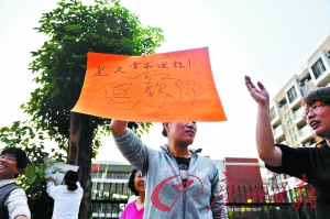 昨日下午4時,數10名家長聚集在了該幼兒園門口,部分心情激動的家長還打出了寫著“堅決反對漲價”和“退回多收學費”的牌子。