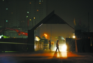 昨天深夜11時(shí)許,記者在望京東湖灣小區(qū)東門看到,這里的在建工地?zé)艋鹜,響聲一片,距離已經(jīng)入住的居民樓不過百米遠(yuǎn)。記者隨即繞行到小區(qū)南門發(fā)現(xiàn),一輛掛著“甘”字車牌的水泥攪拌罐車順著坑洼不平的馬路,駛離了工地。此時(shí),工地大門大敞著,工地內(nèi)另一輛水泥攪拌罐車打著雙閃待命,工地中機(jī)械轟鳴聲不絕于耳,還不時(shí)地傳出施工車輛“嘀、嘀、嘀”的倒車聲,直至今晨零時(shí)記者離開現(xiàn)場(chǎng)時(shí),夜間施工仍未停止。