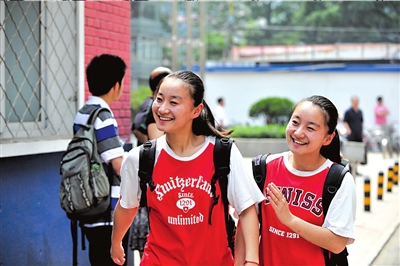 姐妹倆都是中關(guān)村中學(xué)的學(xué)生,姐姐叫王裔文,妹妹叫王裔靜。昨天姐妹倆一起出現(xiàn)在北大附中門口,接送的父母遠(yuǎn)遠(yuǎn)離開(kāi)。和其他女生不一樣,姐妹倆走起路來(lái)虎虎生風(fēng),有點(diǎn)假小子的英氣。對(duì)于頻頻參加重大比賽的姐妹倆來(lái)說(shuō),似乎更能適應(yīng)高考的壓力。她們?cè)谛iT口興奮地和老師、同學(xué)們擊掌打氣,王裔文的班主任開(kāi)玩笑地后退一步:“你的掌力那么大,我可吃不消!