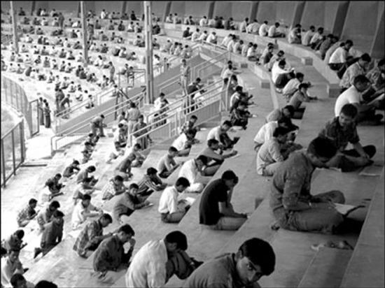 這是印度中央邦的年輕人在一個(gè)體育場(chǎng)里參加該邦警察系統(tǒng)的筆試
