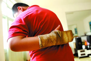 第二次受傷在5月21日。曹力強說,“那節(jié)是社會課,我在課上問了同學(xué)一個問題,教社會課的張老師朝我走過來,我當(dāng)時害怕,就從座位上起身,往教室后面躲,到教室最后面,我拿掃帚擋著身體,張老師抓住我的左胳膊往后別,還掰我手指。”