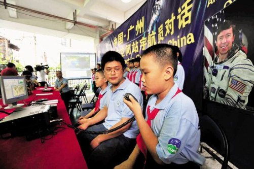 本報(bào)訊 記者蔡惠中攝影報(bào)道:昨日北京時(shí)間16時(shí)26分02秒,一個(gè)電波由廣州市同福中路第一小學(xué)的業(yè)余電臺(tái)發(fā)出,與正飛越廣州上空的國(guó)際空間站的電臺(tái)聯(lián)通上了!這也是我國(guó)小學(xué)生第一次舉辦的國(guó)際空間站業(yè)余無(wú)線電通訊計(jì)劃的活動(dòng)。全程歷時(shí)8分30秒,學(xué)生們提出了20個(gè)問(wèn)題。