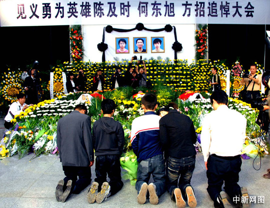 上午的追悼會(huì)由荊州市委副書(shū)記傅立民主持。長(zhǎng)江大學(xué)黨委書(shū)記張忠家在悼詞中說(shuō),三名19歲的大學(xué)生為搶救他人生命,卻不幸離我們而去。我們?yōu)橹,為之感?dòng)。陳及時(shí)、何東旭、方招同學(xué)舍己救人的事跡震撼了古城、感動(dòng)了全國(guó)!幾天以來(lái),學(xué)校師生和社會(huì)各界人士,以多種方式表達(dá)崇敬和哀思。他們的英雄壯舉是良好的家庭教育、學(xué)校教育、社會(huì)教育和自我教育的結(jié)果。