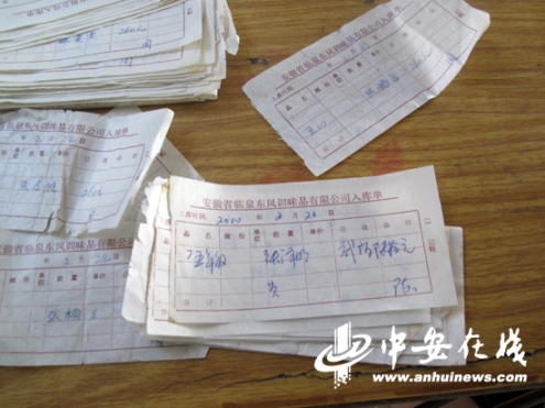 李校長還給記者出示了今年收取260元費用的收據(jù),收據(jù)上居然印著“安徽省臨泉東風調(diào)味品有限公司入庫單”的字樣,上面寫著學生的姓名、班級和所交的260元費用,每一張右下角都是用相同筆跡簽了一個“周”字,據(jù)李校長介紹簽“周”字的人是陳子玉的兒媳婦,她負責來學校收錢。