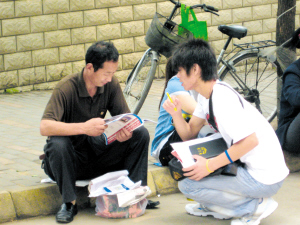 6月7日,高考的第一天。早上7點(diǎn),當(dāng)記者來(lái)到蚌埠市懷遠(yuǎn)縣一中大門口時(shí),發(fā)現(xiàn)這里除了正在等候考試的考生和家長(zhǎng),還有很多手里拿著大堆傳單和招生簡(jiǎn)章的年輕人,并不斷地往家長(zhǎng)和學(xué)生手里塞。