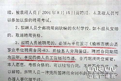 雷波說(shuō),他參加工作后,日子越過(guò)越窮,孩子感冒都不敢去醫(yī)院治療。類似雷波的遭遇,在180名選聘教師的每個(gè)人身上都上演著。從4月2號(hào)開始,這些教師紛紛丟下學(xué)生,到橫山縣人民政府討說(shuō)法。橫山縣人事和勞動(dòng)社會(huì)保障局辦公室的工作人員稱,當(dāng)初的考試是為解決中專生就業(yè)而進(jìn)行的,雷波等人屬于民辦教師,難以做到與中專生同工同酬。