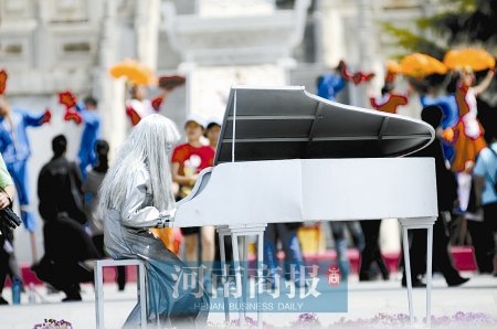 河南開封翰園里游客如織。喧囂的人群中,一尊雕塑寂靜地立在花壇之上,文靜的少女端坐琴前,專注的表情仿若與世隔絕。只有白天的每個(gè)整點(diǎn)時(shí)刻,游客才會(huì)發(fā)現(xiàn)這些雕塑“活著”。