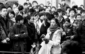 早上7點(diǎn)半,電影學(xué)院院內(nèi)已是人聲鼎沸,前來(lái)趕考的學(xué)生在各自報(bào)考的院系樓前排隊(duì)等著叫號(hào)進(jìn)考場(chǎng)。在備受矚目的報(bào)考大熱門(mén)表演系樓前,1000多名來(lái)自全國(guó)各地的學(xué)生和龐大的“家長(zhǎng)助考團(tuán)”擠滿空?qǐng)觥?/p>