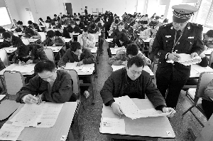 廣州市公安局今年向社會(huì)公開招聘650名交通協(xié)管員,每人每月工資獎(jiǎng)金2100元、社保經(jīng)費(fèi)500元的待遇引來市民火爆報(bào)名,據(jù)了解,共有6002人上交材料和報(bào)名表,有4700名參加了體檢,最終有2616人取得參加昨日筆試的資格。參加筆試者30歲以下的占了四成,女性占了25%。