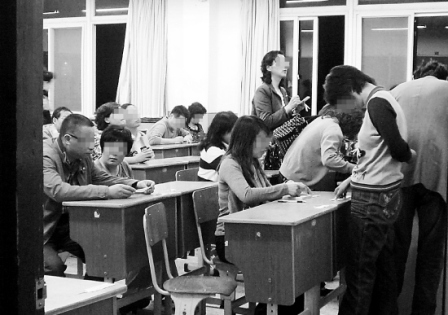 教學(xué)點(diǎn)的墻上貼著一些學(xué)生的進(jìn)步成績表,一名男咨詢員指著其中一個高三學(xué)生的名字說,這個孩子全科補(bǔ),不在學(xué)校晚自習(xí)了,家長為此已投入7 萬多元!盀榱撕⒆拥膶,投入還是值得的!彼f,“孩子在學(xué)校晚自修效率不高,學(xué)校老師要管很多學(xué)生,如果你孩子不主動,老師也很難顧及到!