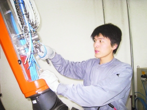 車間的流水線突然發(fā)出報警,機(jī)器人隨之停止工作。4月10日上午10時,楊雪峰正坐在中控室監(jiān)視流水線運(yùn)轉(zhuǎn),面前的紅燈閃個不停。他拎起工具包,和師傅跑到報警機(jī)器前。一個兩米多高的機(jī)器人“罷工”了!斑@個機(jī)器人是專給車身噴漆的,它一停,整個流水線就不能運(yùn)轉(zhuǎn)了!睏钛┓蹇刂谱⌒睦锏木o張,緊握扳手的右手有些微微顫抖,爬上流水線和師傅一起查找原因,“進(jìn)廠后就沒修過機(jī)器人這個大家伙,在師傅身后學(xué)了半年,這回終于派上用場了。”
