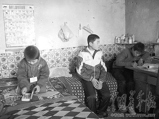 11月24日,甘肅會寧,趙小虎兄弟三人蝸居在縣城僅有15平方米的出租屋內(nèi)讀書。他們家是會寧陪讀家庭的一萬分之一。陪讀的爺爺靠擺水果攤掙生活費,奶奶為他們洗衣做飯。 本報記者 張鵬攝
