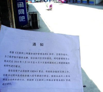 5月30日,有網(wǎng)友在天涯社區(qū)發(fā)帖稱,5月25日山西臨縣網(wǎng)吧協(xié)會貼出了網(wǎng)吧關(guān)閉的公告:“有關(guān)部門要求網(wǎng)吧停業(yè),具體何時開放另行通知!痹摼W(wǎng)友稱據(jù)傳是因為即將到來的高考而強制關(guān)閉了該縣城所有網(wǎng)吧,“全縣所有的網(wǎng)吧都在劫難逃,光纜被停,只能用電話線上網(wǎng)!