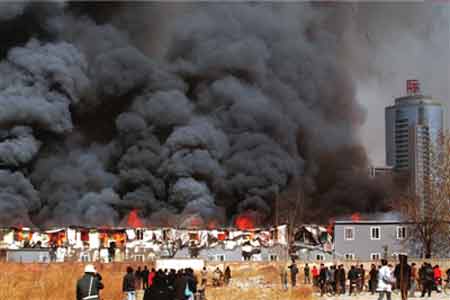 據(jù)市消防局通報,朝陽消防支隊共調(diào)集了5個中隊、24部消防車、140余名官兵參與滅火。由于著火的臨建樓彩鋼板保溫材料燃燒速度快,加之宿舍內(nèi)易燃物較多,直到11點09分,大火才被基本撲滅,臨建宿舍的B、C、D區(qū)完全燒塌。