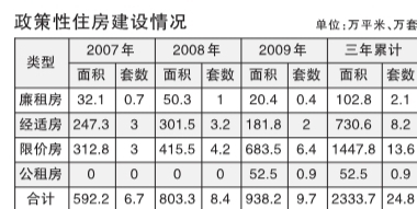 在住房保障方面,自2007年至2009年,本市已累計建設(shè)了24.8萬套政策性住房。其中限價房套數(shù)最多,達到13.6萬套。