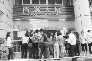 中國證券報記者在檔案大廈四樓業(yè)務大廳看到,一間100平方米左右的房間開設了7個服務窗口,每個窗口前都擠滿了人。而在檔案大廈外面,沒能排到號的市民遲遲不愿離去,任憑保安反復解釋,人群仍是相當激動。